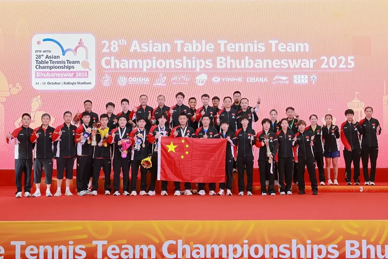 国乒永远是个团结一心的大家庭,在颁奖仪式过后,男女团也进行了家庭合影,所有队员,教练和工作人员都齐了。