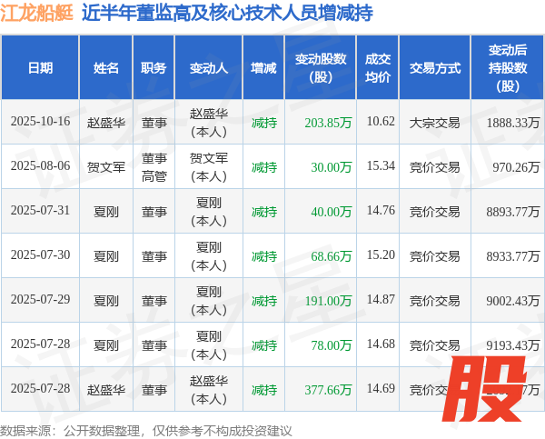 江龙船艇近半年内的董监高及核心技术人员增减持详情如下: